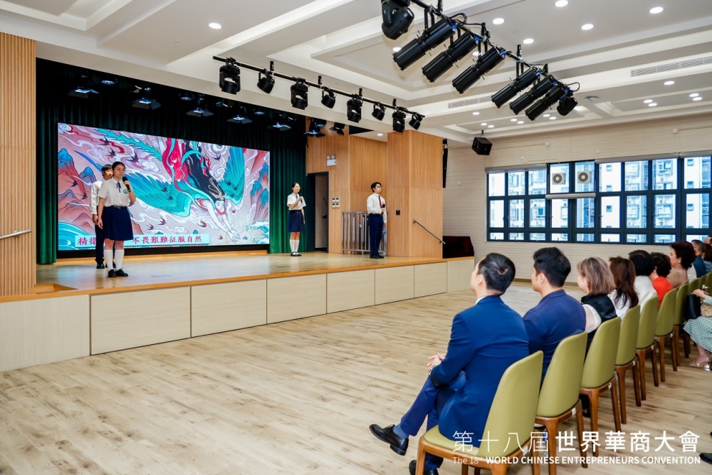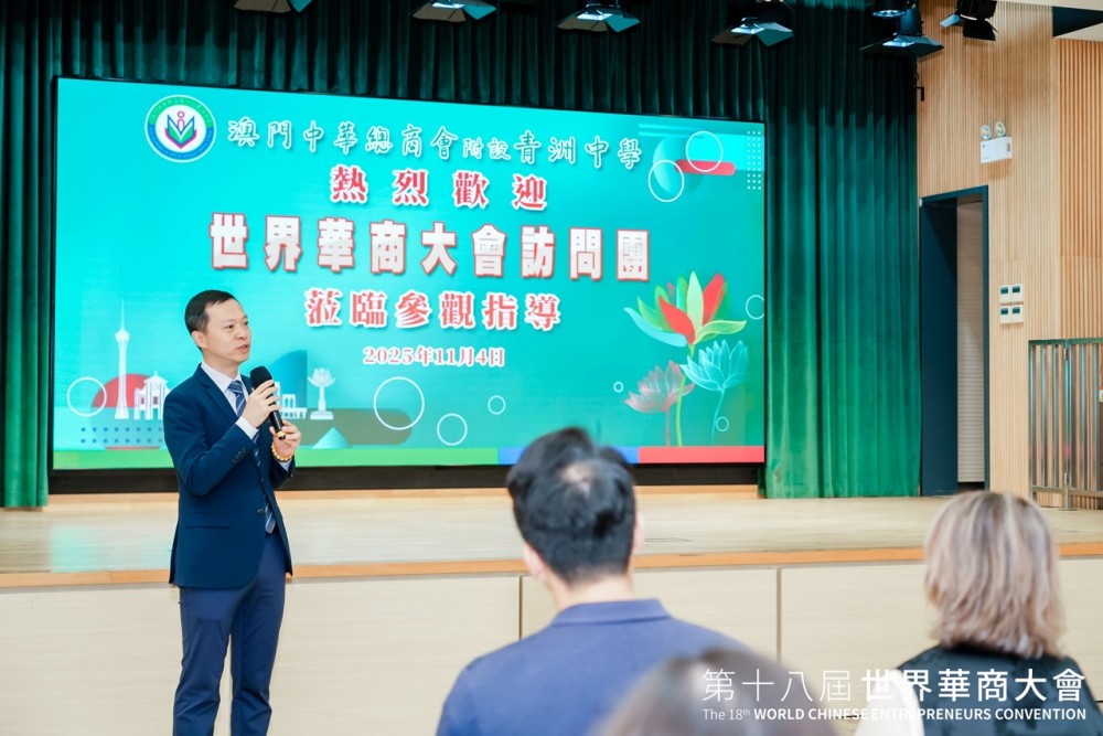在十一樓禮堂,介紹我校的發展歷程的學校宣傳片介紹了我校從最初的篳路藍縷到如今的桃李芬芳,從單一的教學模式到多元的特色課程,堅守與創新並舉,傳承與開拓共進。接著張捷校長致熱情洋溢的歡迎詞,向來賓介紹澳門青洲中學的發展歷程以及回歸後政府對教育的大力支持和投入,學校由傳統的傳承到現代資訊教育的融合,辦學理念的秉承和創新,以及對未來的展望和期冀。賀定一會長也有感而發,即席發言。他深情回顧了澳門中華總商會附設的商訓學校和青洲中學的辦學歷程:那些既要讀書又要上班,在忙碌中努力求學的身影,用堅韌的意志和不懈的努力,詮釋著教育的力量與價值。