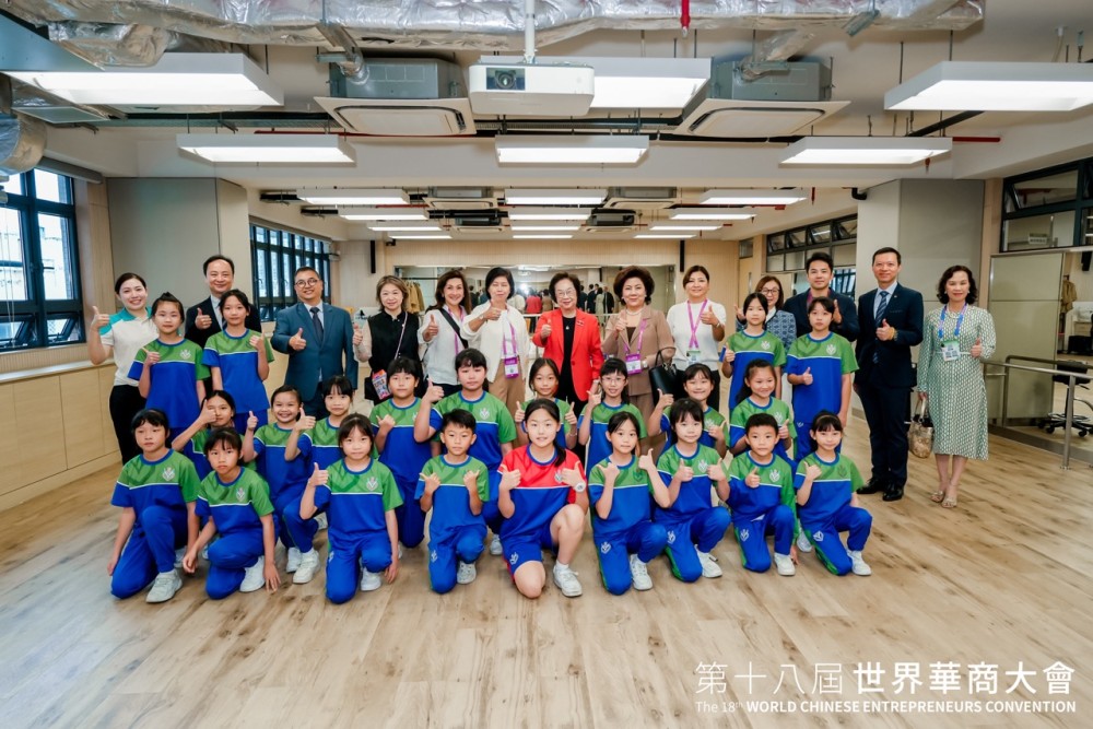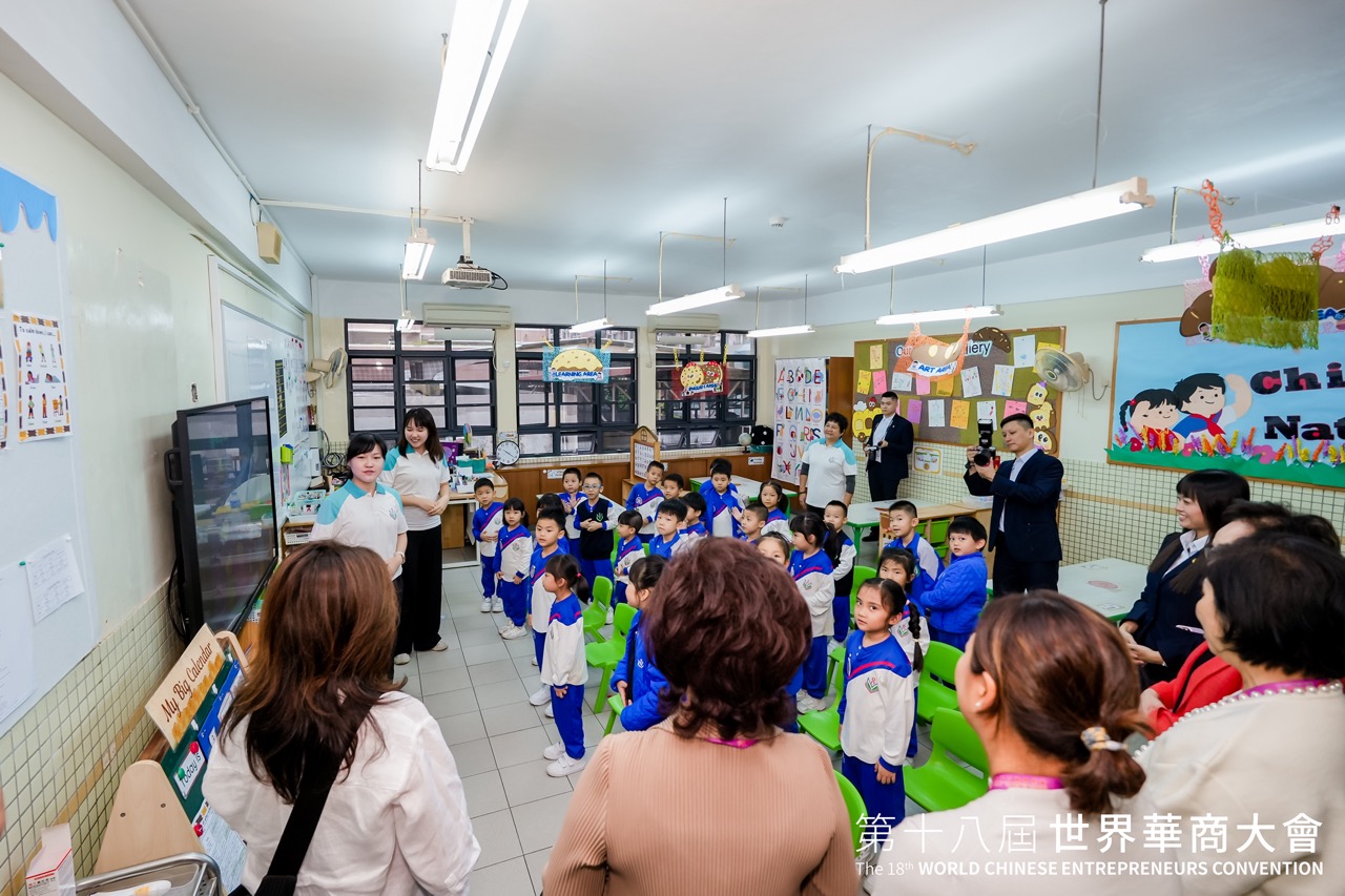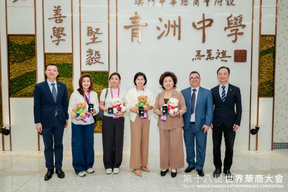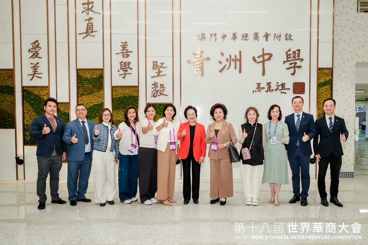 秋陽杲杲,惠風含香。十一月四日九時許,世界華商大會訪問團貴賓:新加坡中華總商會高泉慶會長夫人Marilyn Yuen Woon Siew(袁婉秀)女士、泰國中華總商會婦女部主席林楚欽會長夫人林陳麗惜女士、澳大利亞中華總商會林惠強會長夫人鄧麗霞女士、韓國中華總商會袁國棟會長夫人徐麗芳女士等一眾華商領袖及夫人等,在澳門中華總商會賀定一副會長、林燕妮副理事長、余昇常務理事、婦委會林丁丁常委引導下翩然而至,澳門中華總商會教育顧問高展鴻先生、張捷校長率一眾行政以飽滿的熱情和誠摯的敬意,迎接嘉賓的蒞臨指導。