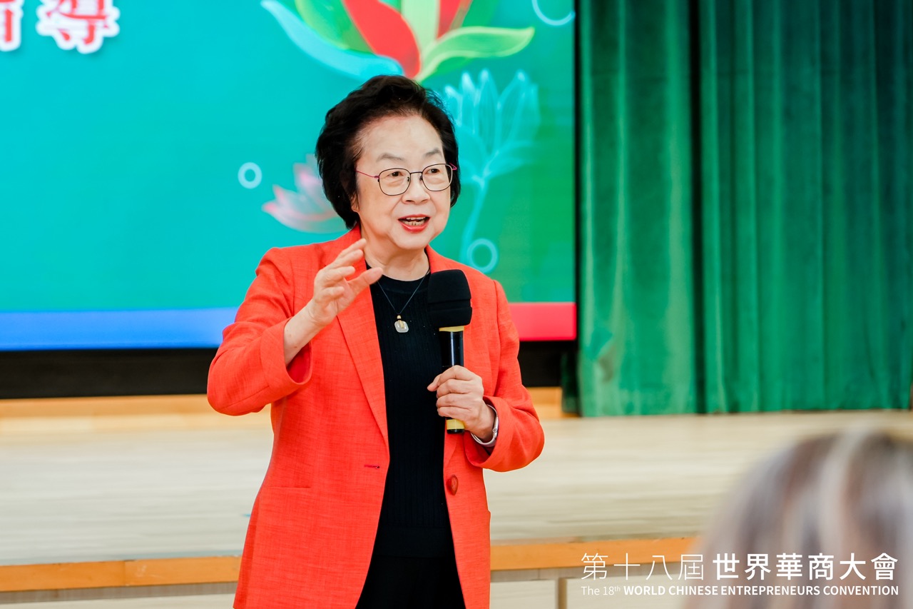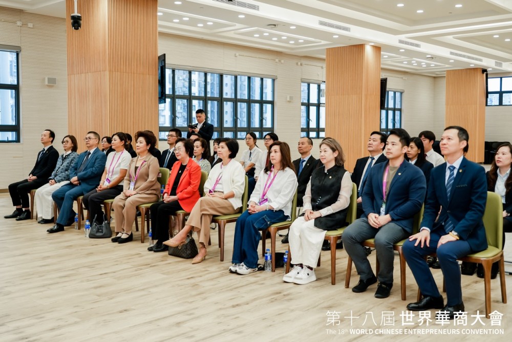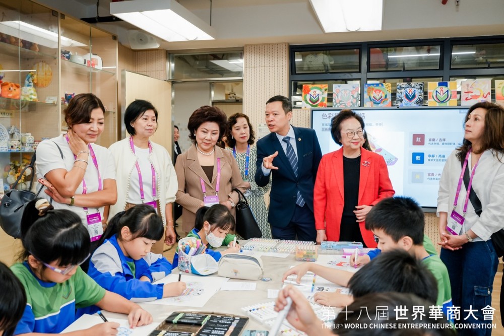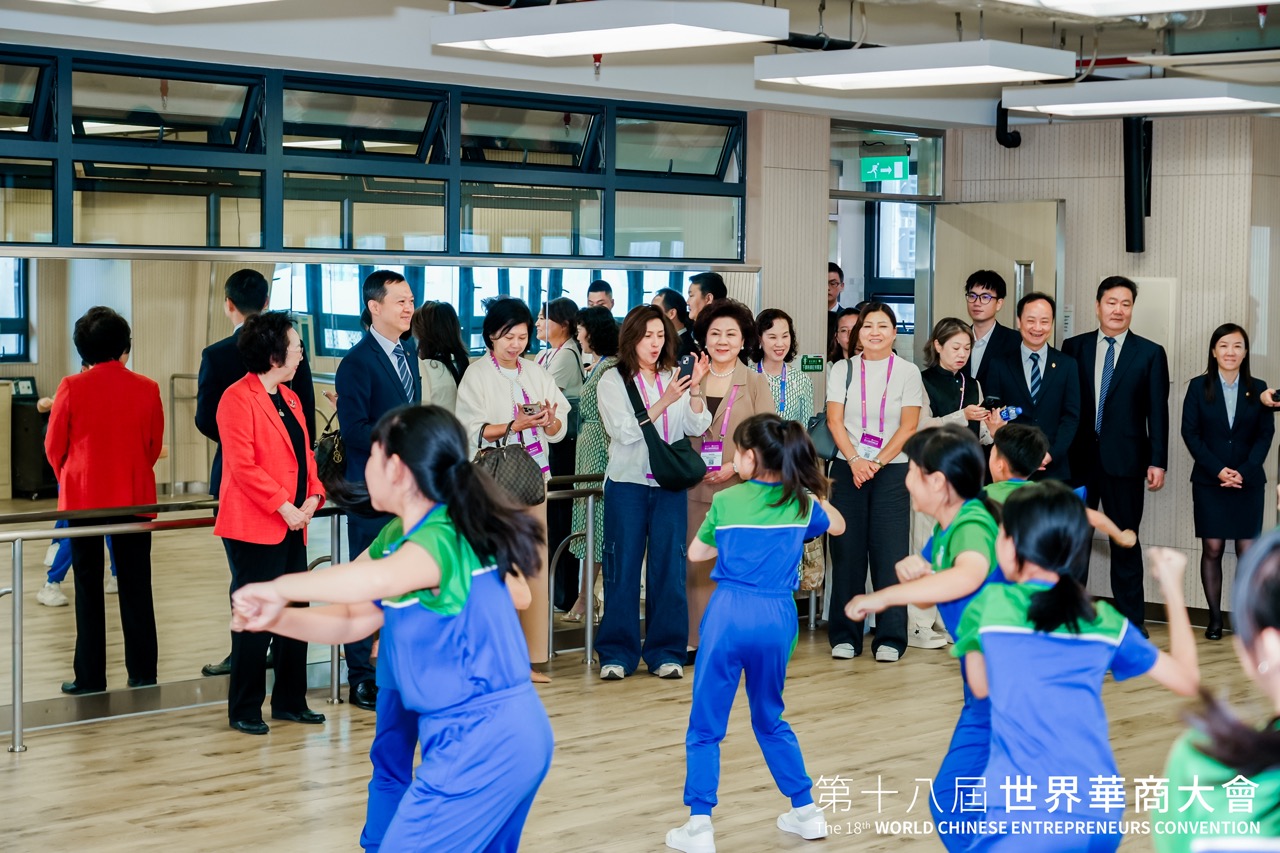 秋陽杲杲,惠風含香。十一月四日九時許,世界華商大會訪問團貴賓:新加坡中華總商會高泉慶會長夫人Marilyn Yuen Woon Siew(袁婉秀)女士、泰國中華總商會婦女部主席林楚欽會長夫人林陳麗惜女士、澳大利亞中華總商會林惠強會長夫人鄧麗霞女士、韓國中華總商會袁國棟會長夫人徐麗芳女士等一眾華商領袖及夫人等,在澳門中華總商會賀定一副會長、林燕妮副理事長、余昇常務理事、婦委會林丁丁常委引導下翩然而至,澳門中華總商會教育顧問高展鴻先生、張捷校長率一眾行政以飽滿的熱情和誠摯的敬意,迎接嘉賓的蒞臨指導。