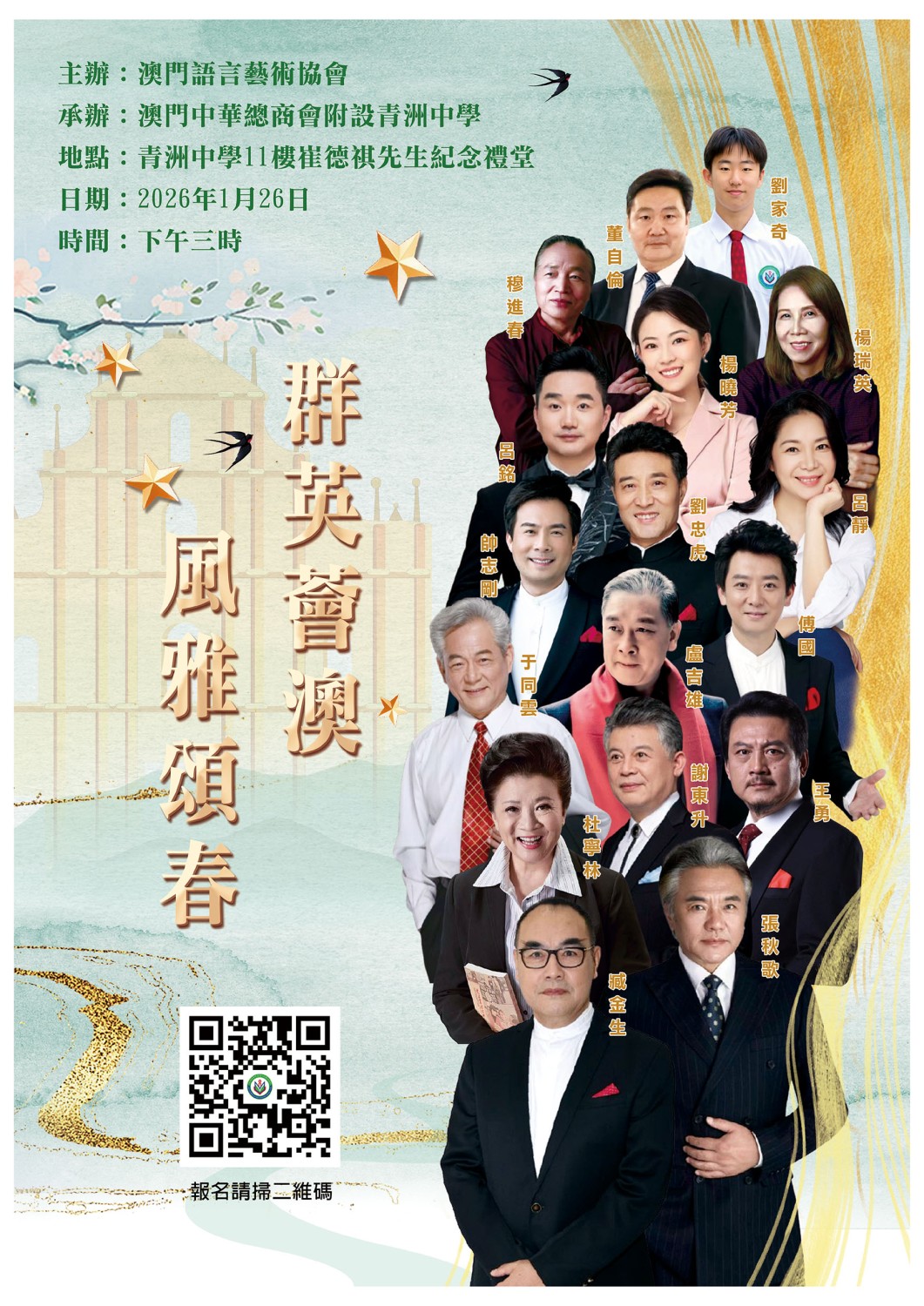 本校將於2026年1月26日下午3時舉辦《群英薈澳,風雅頌春》朗誦會,特邀五位國家一級演員,以及來自各地朗誦協會的會長、副會長聯袂演出,示範經典詩文朗誦之精髓。現正接受公眾報名,誠邀掃瞄二維碼參與(名額有限)。