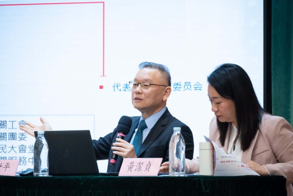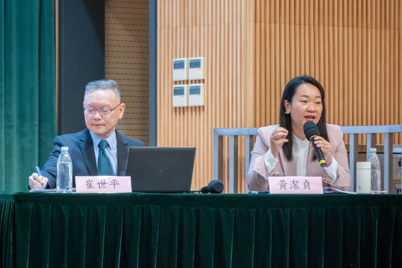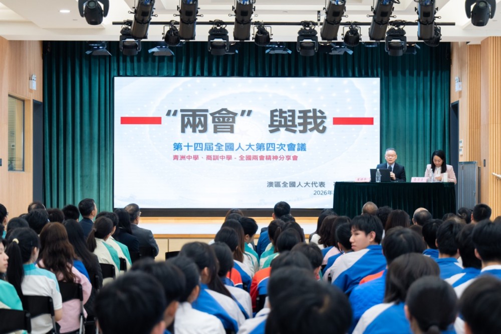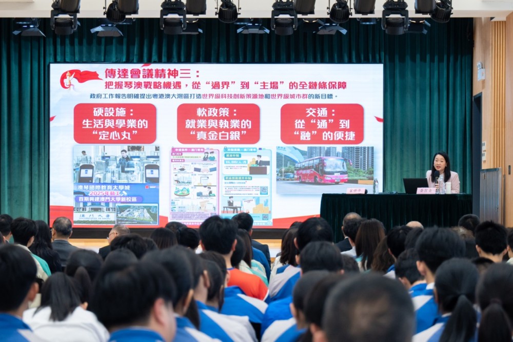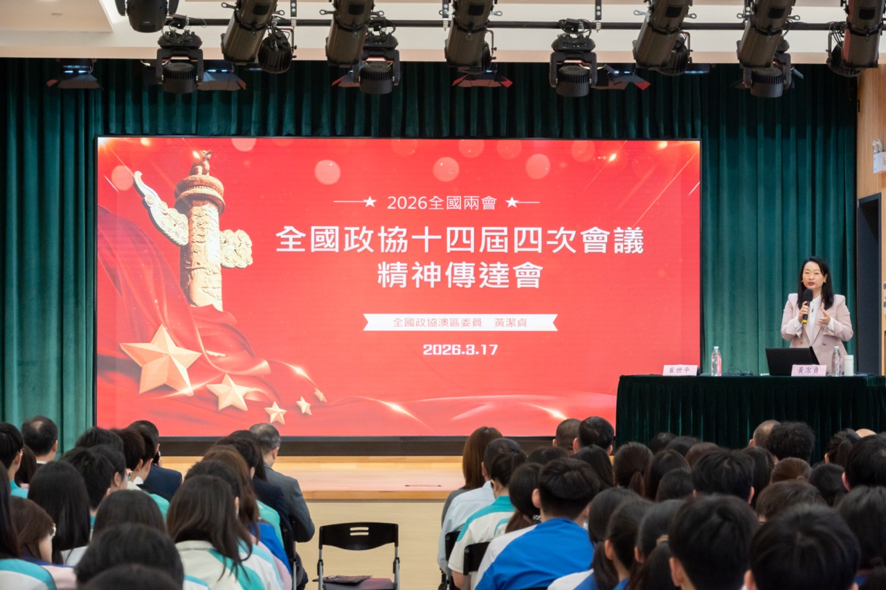 黃潔貞委員以“關心國家事、關心澳門事、關心自己事”勉勵學生,闡述“十五五”時期強國建設目標與澳門“1+4”經濟適度多元策略的結合。她以“新”與“心”概括兩會精神——國家既重視科技創新與新質生產力,也堅持以人民為中心的發展思想,並為港澳居民融入國家發展提供政策支持。