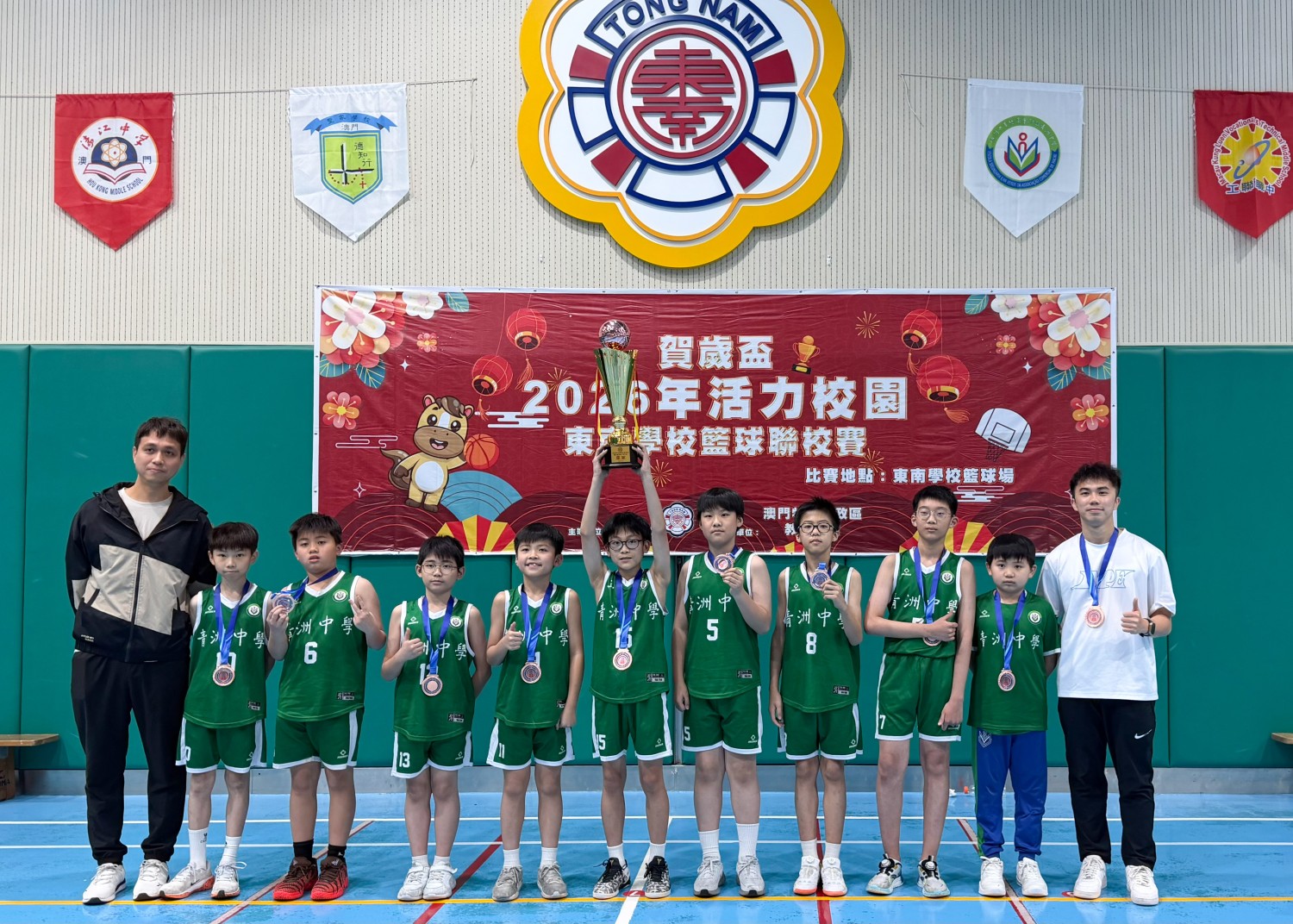 2026年1月31日舉行的沙坊聯校小籃球邀請賽中,我校籃球隊與教業中學、東南學校、沙梨頭坊眾學校、新華中學、同善堂中學等多校隊伍同場競技。隊員沉著應對、攻守有序,憑藉穩健發揮一路領先,最終勇奪冠軍,為新一年賽事贏得亮眼開局。