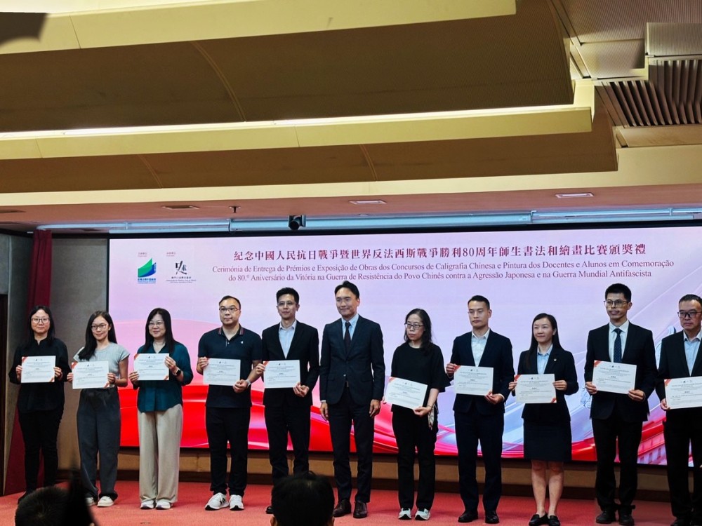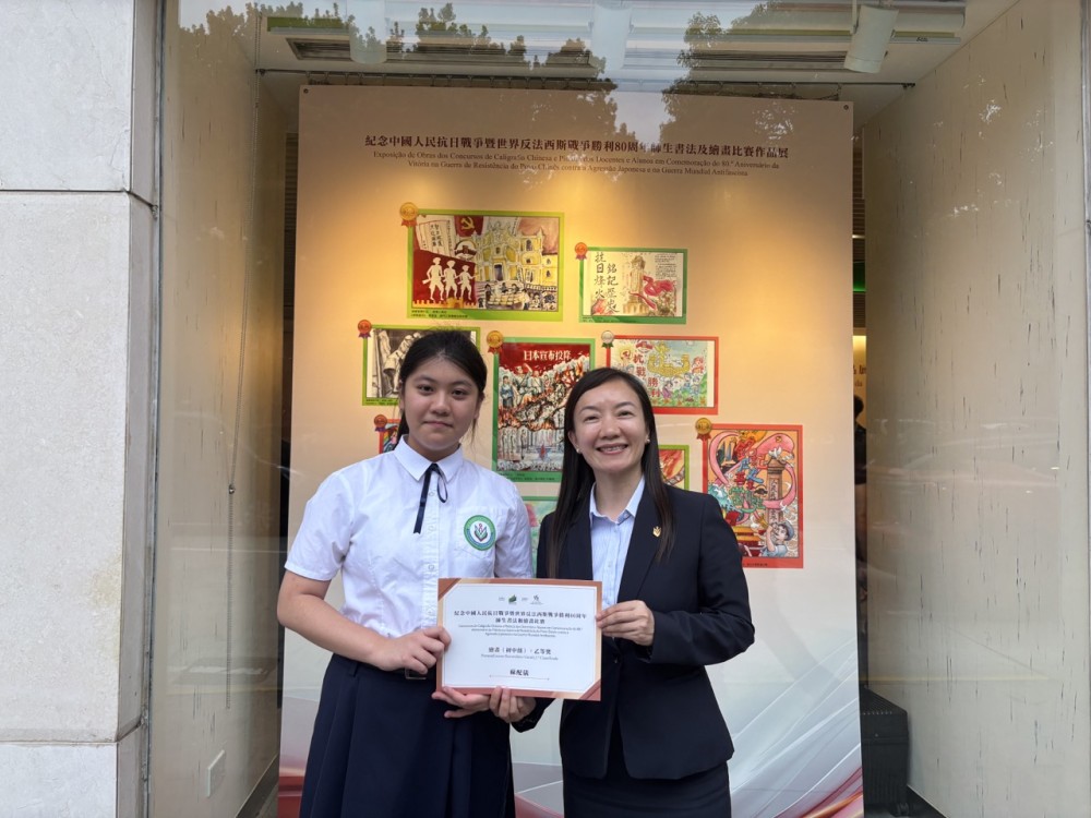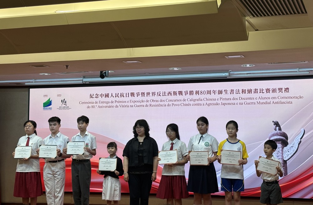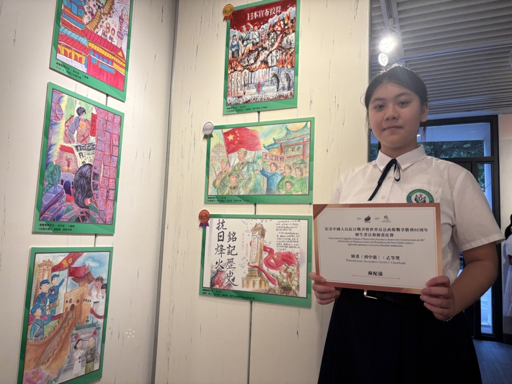 由教青局主辦的“紀念中國人民抗日戰爭暨世界反法西斯戰爭勝利80周年”師生書法和繪畫比賽,得到澳門教育界熱烈響應,共收到381份參賽作品。經過激烈角逐與專業評審,我校多組別優秀作品脫穎而出,充分展現新時代青少年的愛國情懷與藝術才華。獲獎名單如下:繪畫-高中組入圍獎:蘇稚媛(高二甲)、張嘉晴(高二乙)繪畫-初中組乙等獎:蘇配儀(初二丙)入圍獎:魏嘉誼(高一甲)、劉藹盈(高一甲)書法-高小組入圍獎:凌嘉榮(小六丙)