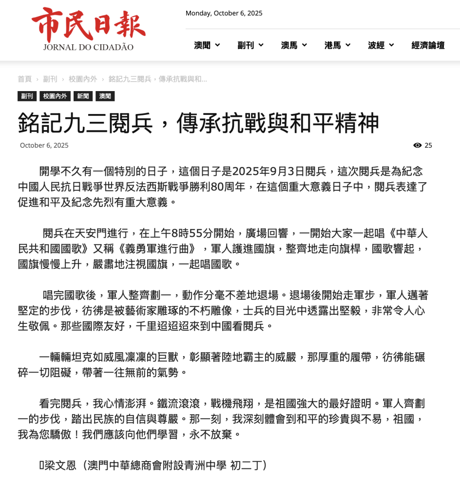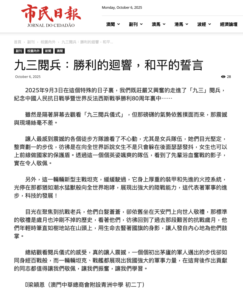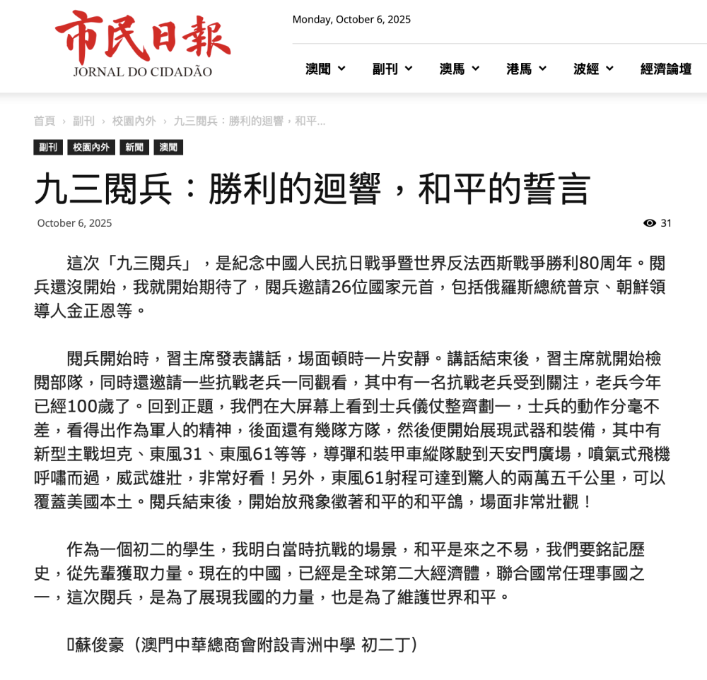 我校胡菲兒、蘇俊豪、梁穎恩、梁文恩同學撰寫的「九三閱兵」主題感想文章,近日獲澳門《市民日報》及其官方網站刊載。同學們以閱兵儀式為切入點,結合自身感悟,生動記述紀念抗戰勝利80週年閱兵的盛大場面,抒發心中澎湃的家國情懷。文章字裡行間洋溢著對祖國的熱愛,展現出新時代青少年銘記歷史、傳承和平精神的堅定信念。