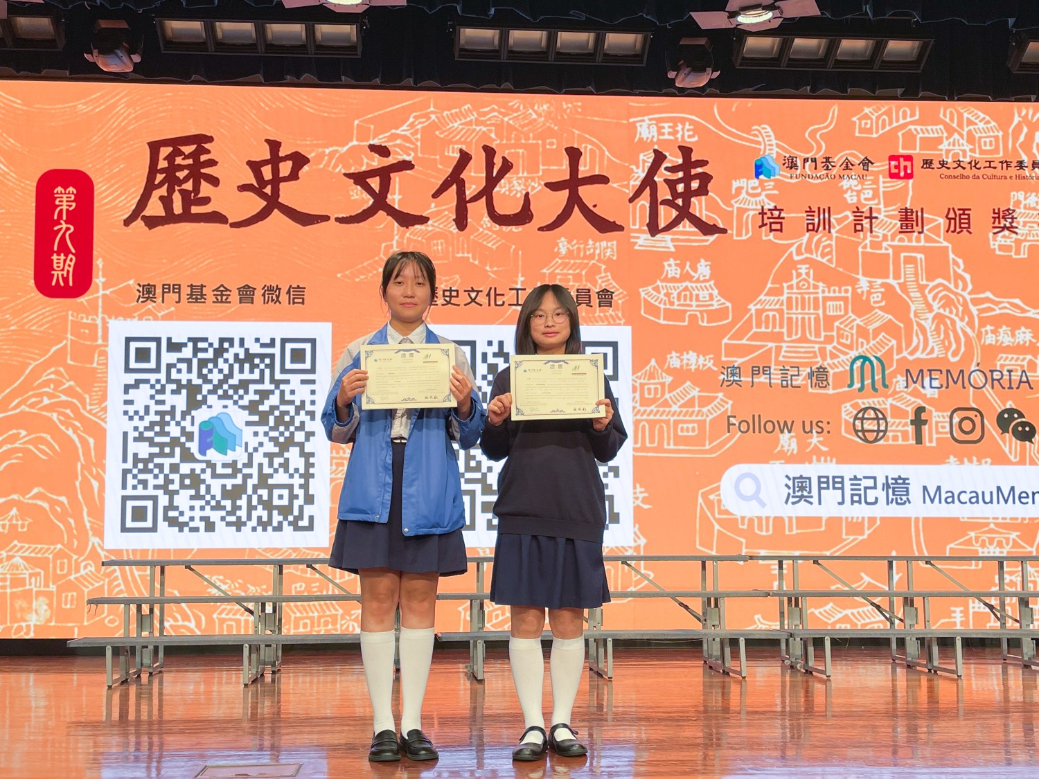 在澳門基金會與澳門歷史教育學會合辦的第九期「歷史文化大使培訓計劃」中,我校李玟穎(高一丙)與甘綺雯(高二乙)同學表現出色,順利完成培訓並獲頒畢業證書。兩位同學更憑藉優秀的報告成果,榮獲「最佳報告獎」,充分展現出卓越的學習能力與團隊協作精神。