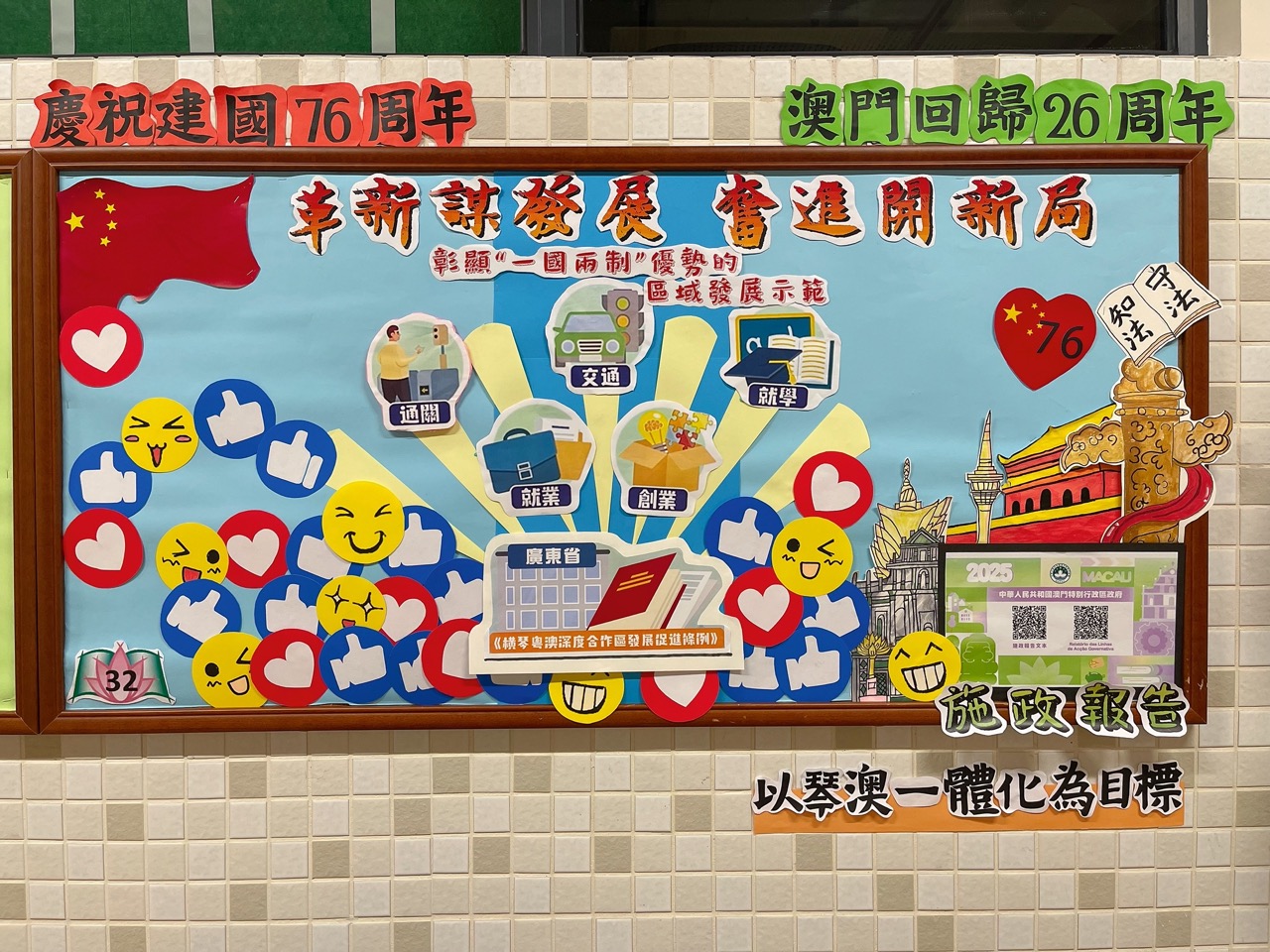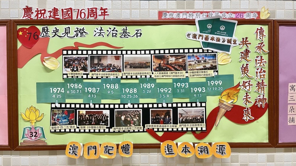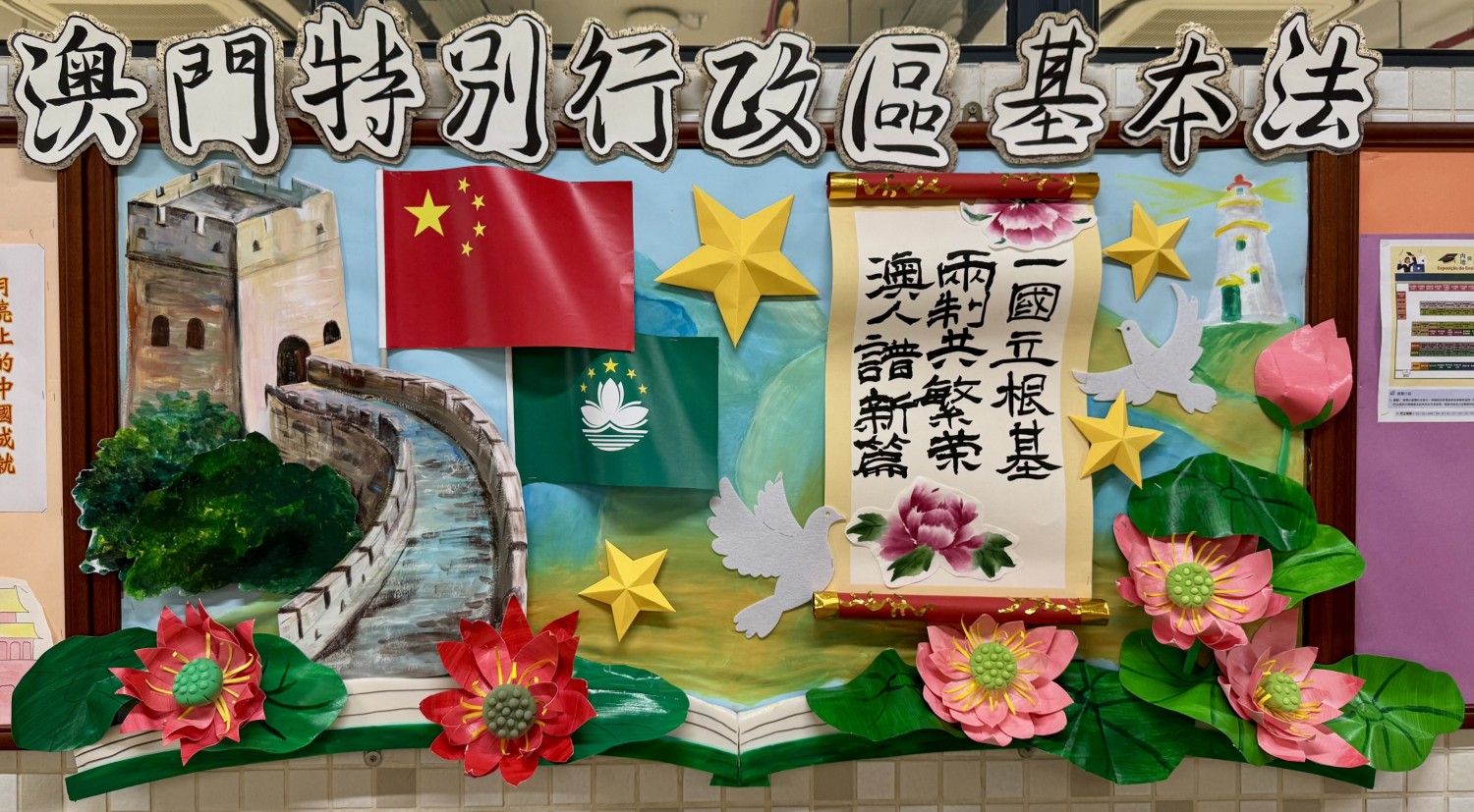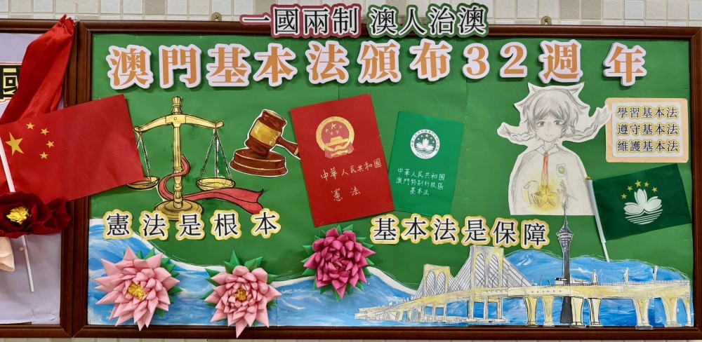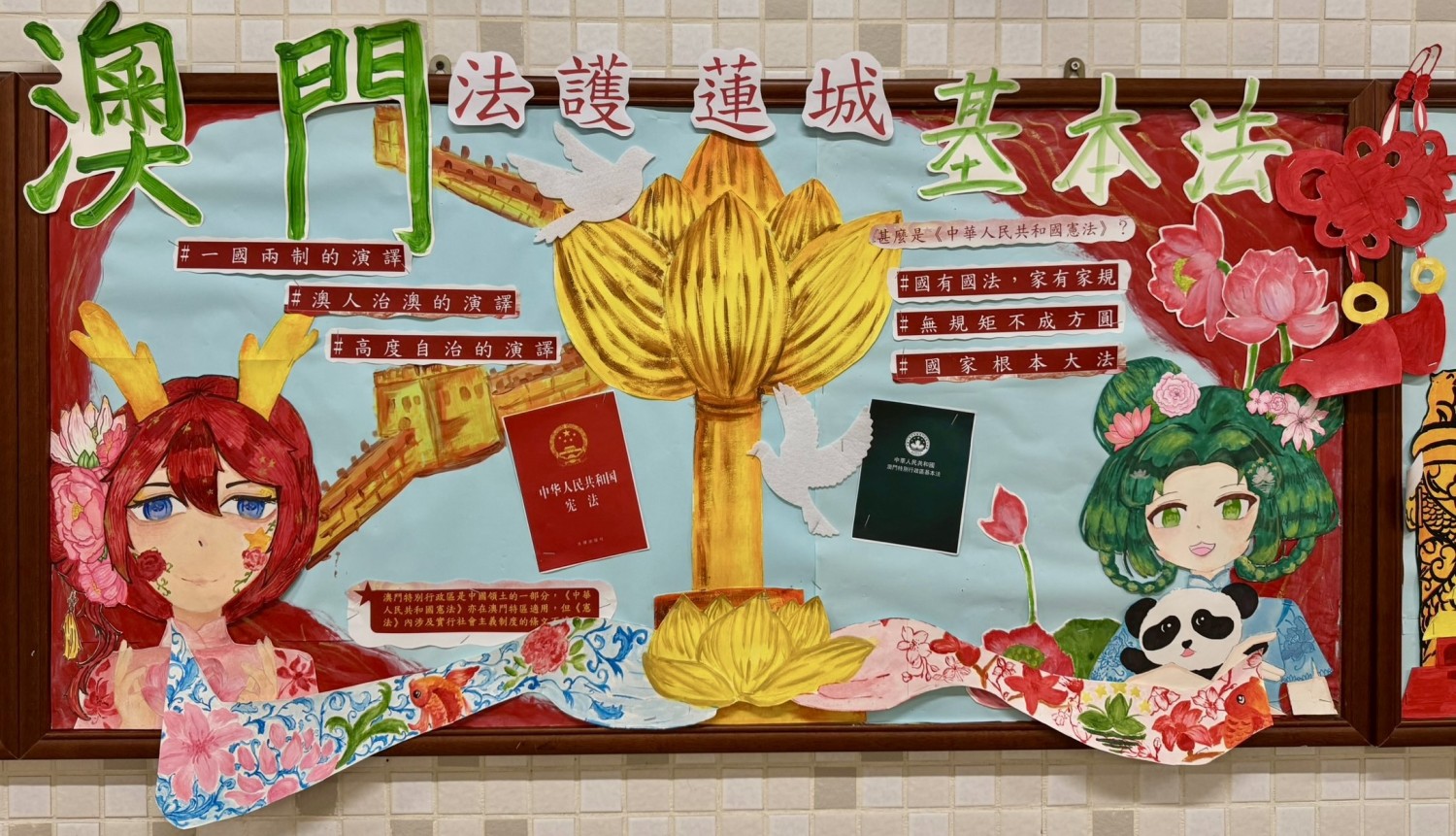為加強學生愛國愛澳情懷,並在校園進一步推廣憲法與基本法,我校組織學生參加了澳門基本法推廣協會主辦的「基本法校園壁報設計比賽」,最終中、小學部均榮獲多項優異成績。獲獎名單如下:中學組二等獎:高二甲入選獎:初三丙、初二甲小學組三等獎:小六乙入選獎:小六丙