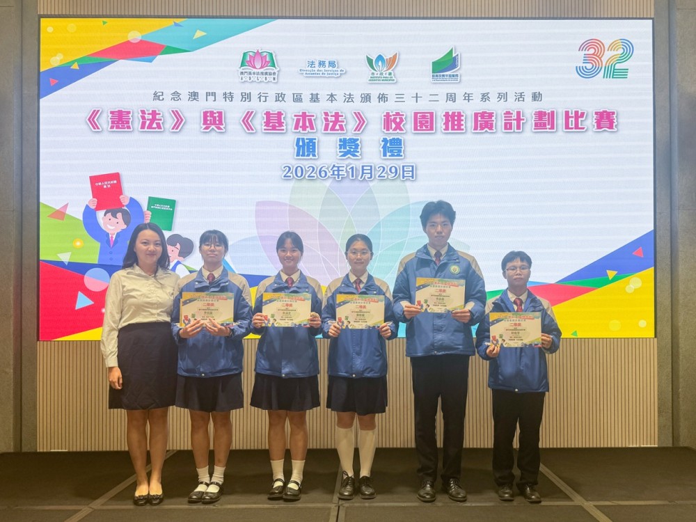 日前,我校學生參加由教育及青年發展局、市政署、法務局及澳門基本法推廣協會聯合舉辦的「《憲法》與《基本法》校園推廣計劃比賽」。參賽同學積極籌劃、全心投入,設計並開展一系列趣味與意義兼具的校園推廣活動,使《憲法》與《基本法》知識更生動地融入校園生活。我校以下同學表現優異,榮獲二等獎:林俊宇、李嘉鑫、蘇稚媛(高二甲班)林滿芝、李曉盈(高二乙班)