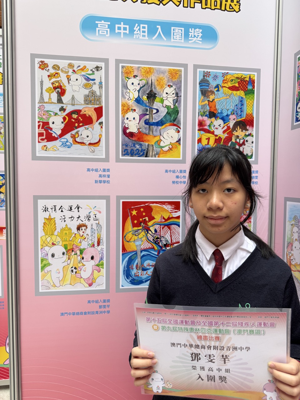 獲獎喜訊:我校學生於全運會徵文繪畫比賽榮獲佳績 在日前由教育及青年發展局、第十五屆全國運動會及全國第十二屆殘疾人運動會暨第九屆特殊奧林匹克運動會澳門賽區籌備辦公室合辦,並由澳門中華教育會承辦的相關徵文及繪畫比賽中,我校學生表現出色,榮獲佳績。獲獎名單如下:入圍獎:鄧雯芊(高二甲班)