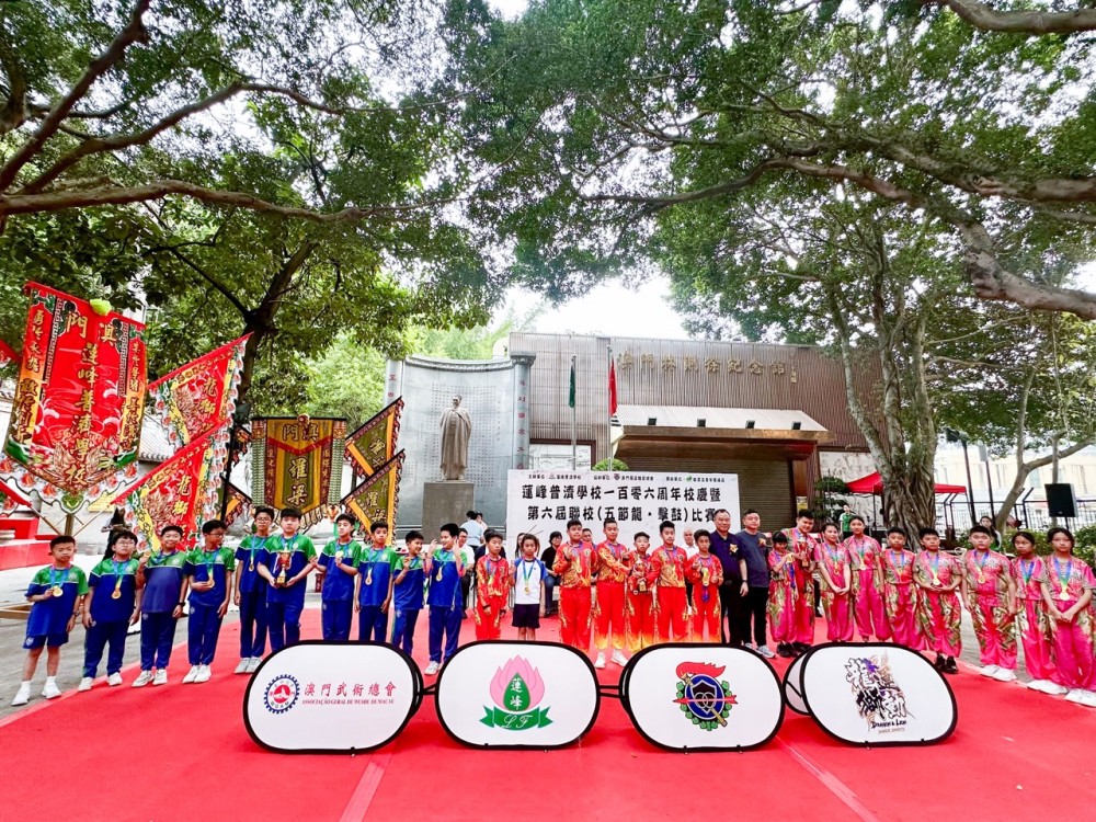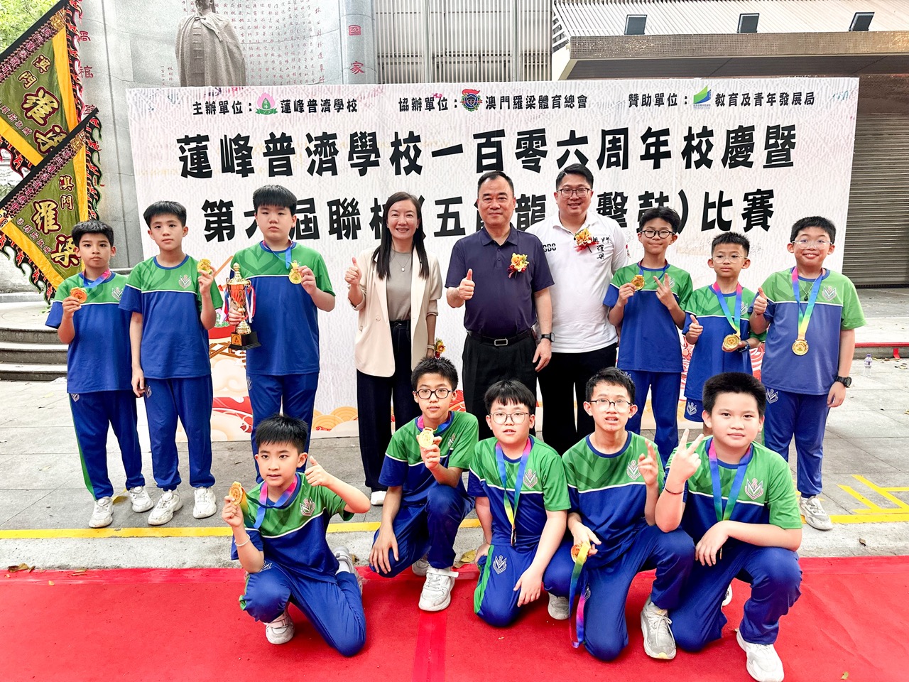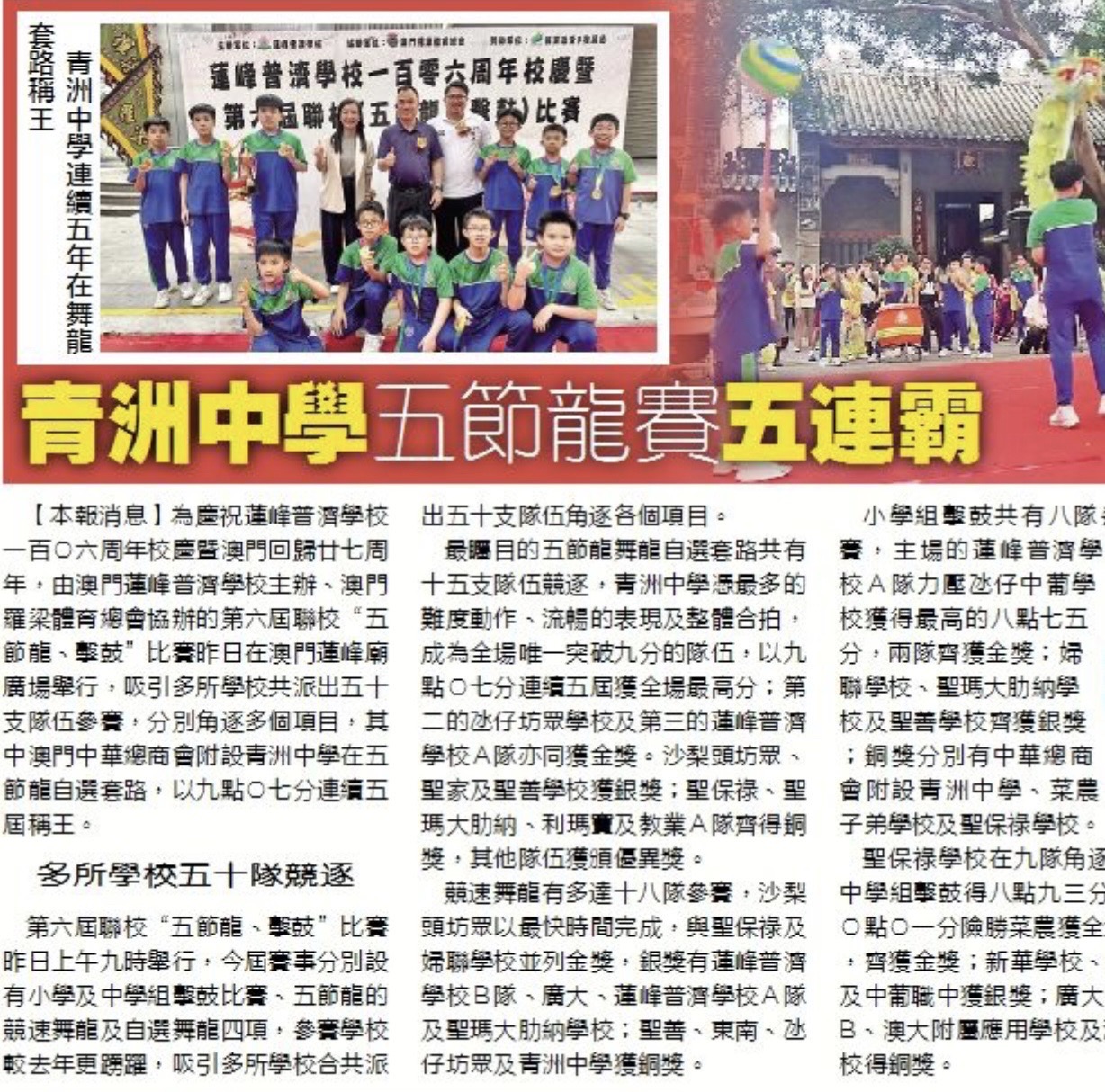 日前,我校龍獅隊參與由澳門蓮峰普濟學校主辦、澳門羅梁體育總會協辦的「第六屆聯校五節龍擊鼓比賽」,共吸引五十支隊伍參賽。經過精彩角逐,我校在套路、擊鼓和競速項目中勇奪一金兩銅的優異成績,其中自選套路項目更成為該項賽事首支達成五連霸的隊伍,實屬難得!